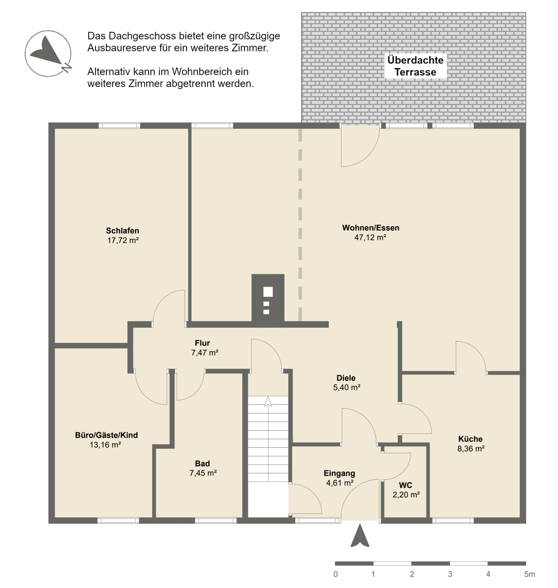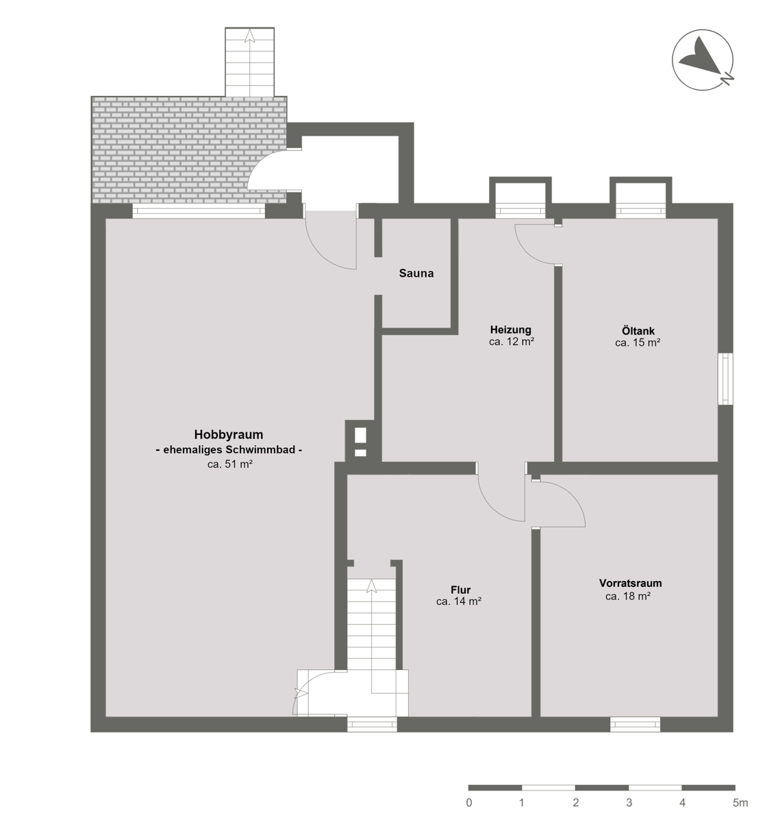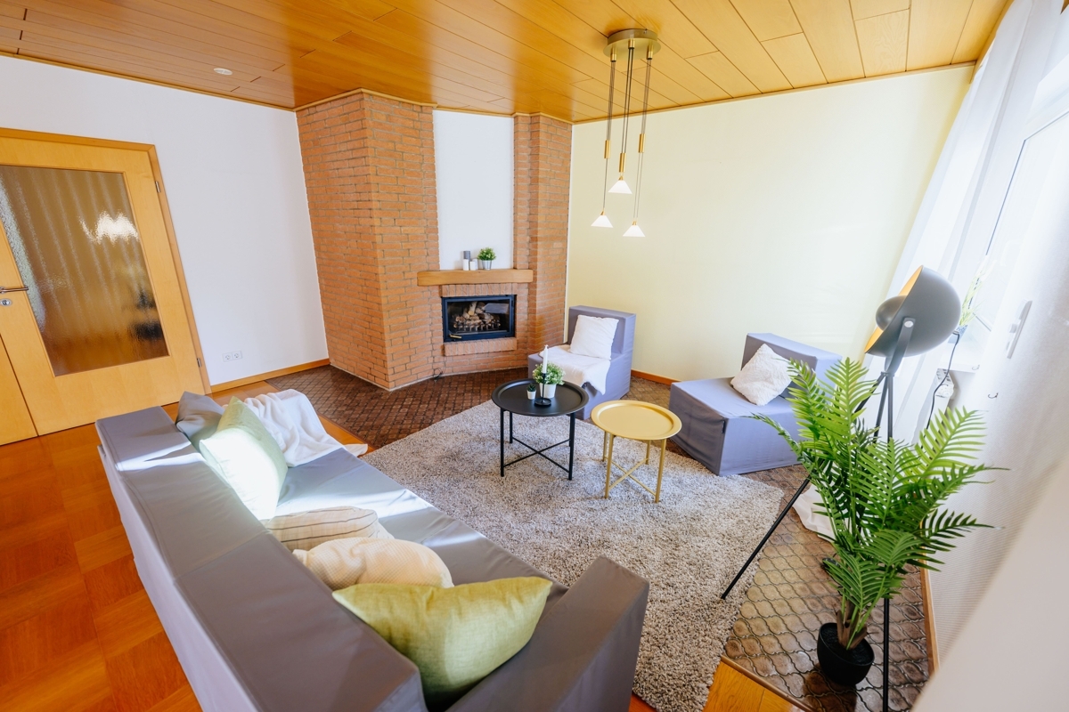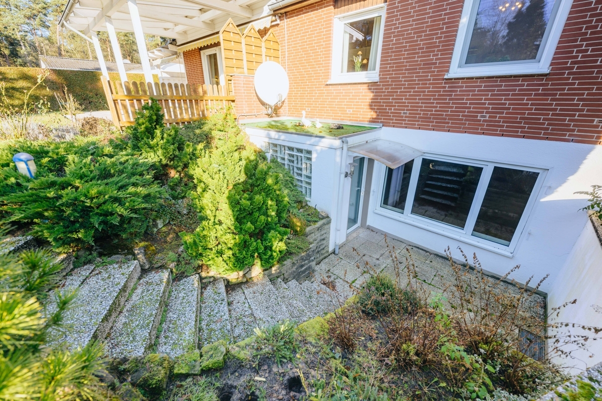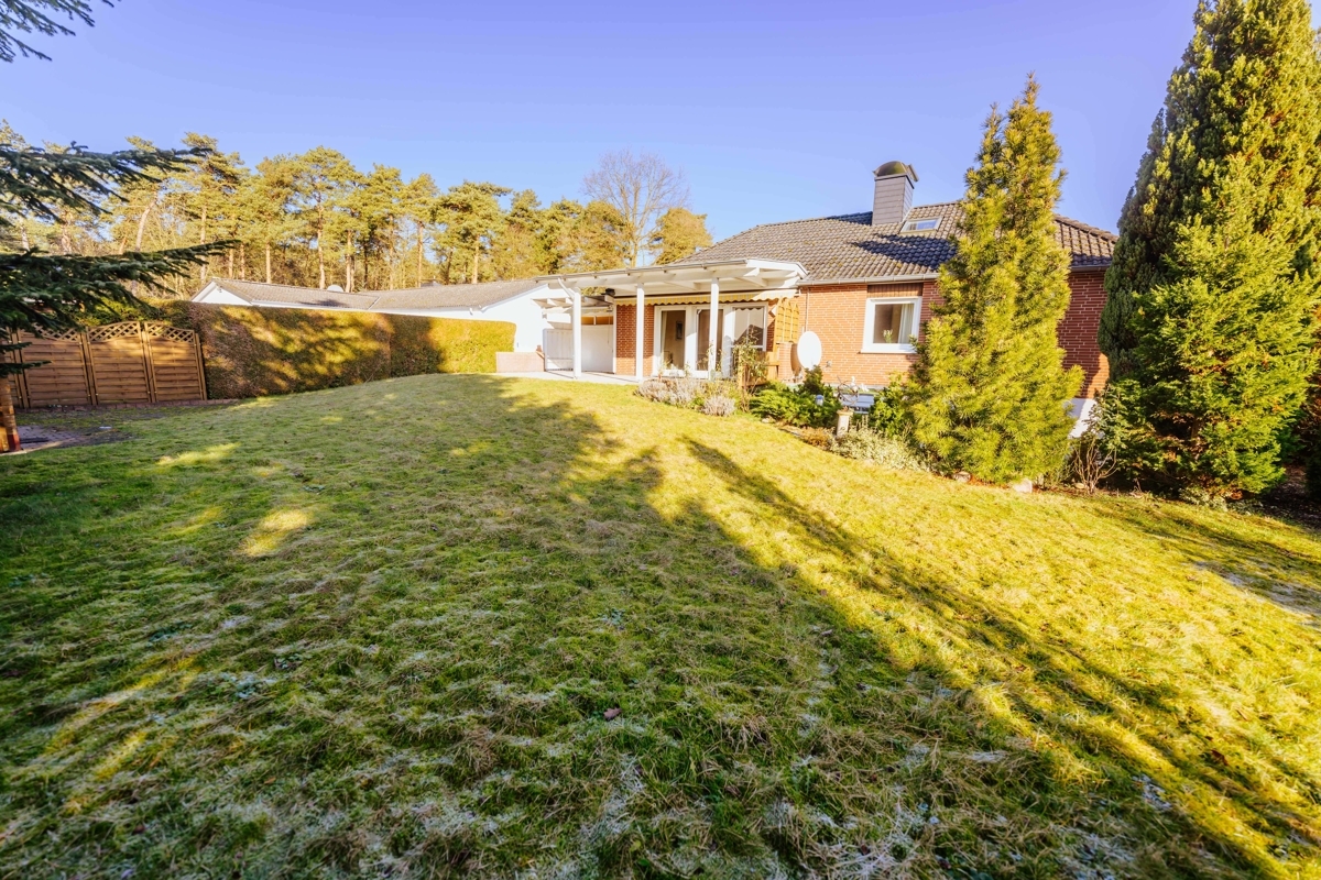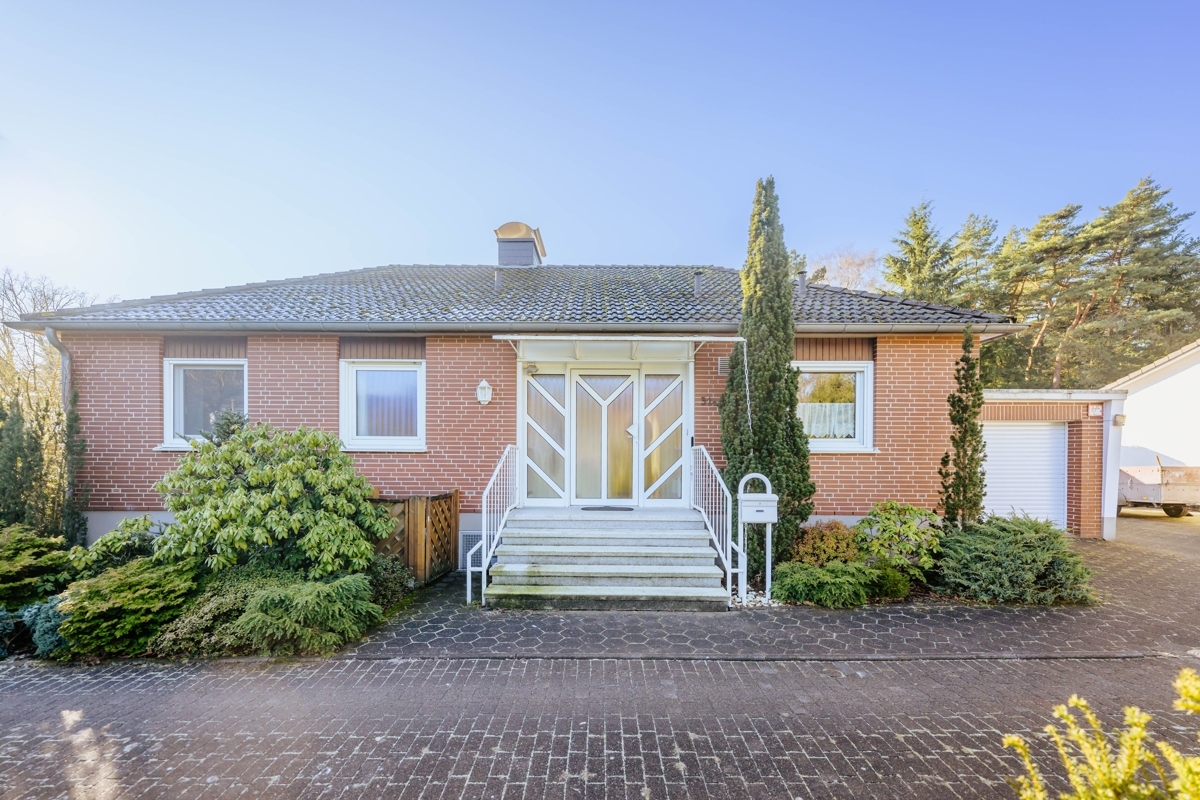 Auf einer Ebene komfortabel leben! Über eine Privatstraße mit nur 4 Anliegern erreicht man das schöne Süd-West-Grundstück am Waldrand. Eine Garage mit Abstellraum befindet sich unmittelbar am verklinkerten Gebäude, welches von der bekannten Firma OKAL in Fertigbauweise errichtet wurde. Über wenige Stufen gelangt man zum Hauseingang und auf die große Wohndiele - alternativ gelangt man auch ebenerdig durch den Garten ins Haus. Der helle Wohn-/ Essbereich mit Kamin, Parkettboden und über 47 m² Wohnfläche schafft eine tolle Wohlfühlatmosphäre. Von hier aus gelangt man auf die große, überdachte Terrasse von der Sie einen tollen Blick in Ihren Garten genießen. Ergänzt wird das Raumangebot auf einer Ebene durch die Küche, ein Gäste-WC und zwei weitere Zimmer. Das Bad verfügt über eine Badewanne sowie eine Dusche und präsentiert sich in heller, freundlicher Optik. Der Keller bietet neben ausreichend Abstellfläche auch einen beheizten Raum (ehemaliges Schwimmbad), der auf über 50 m² Platz für Ihr individuelles Hobby bietet. Durch die Kelleraußentreppe ist der Hobbyraum direkt mit dem Garten verbunden.Lage