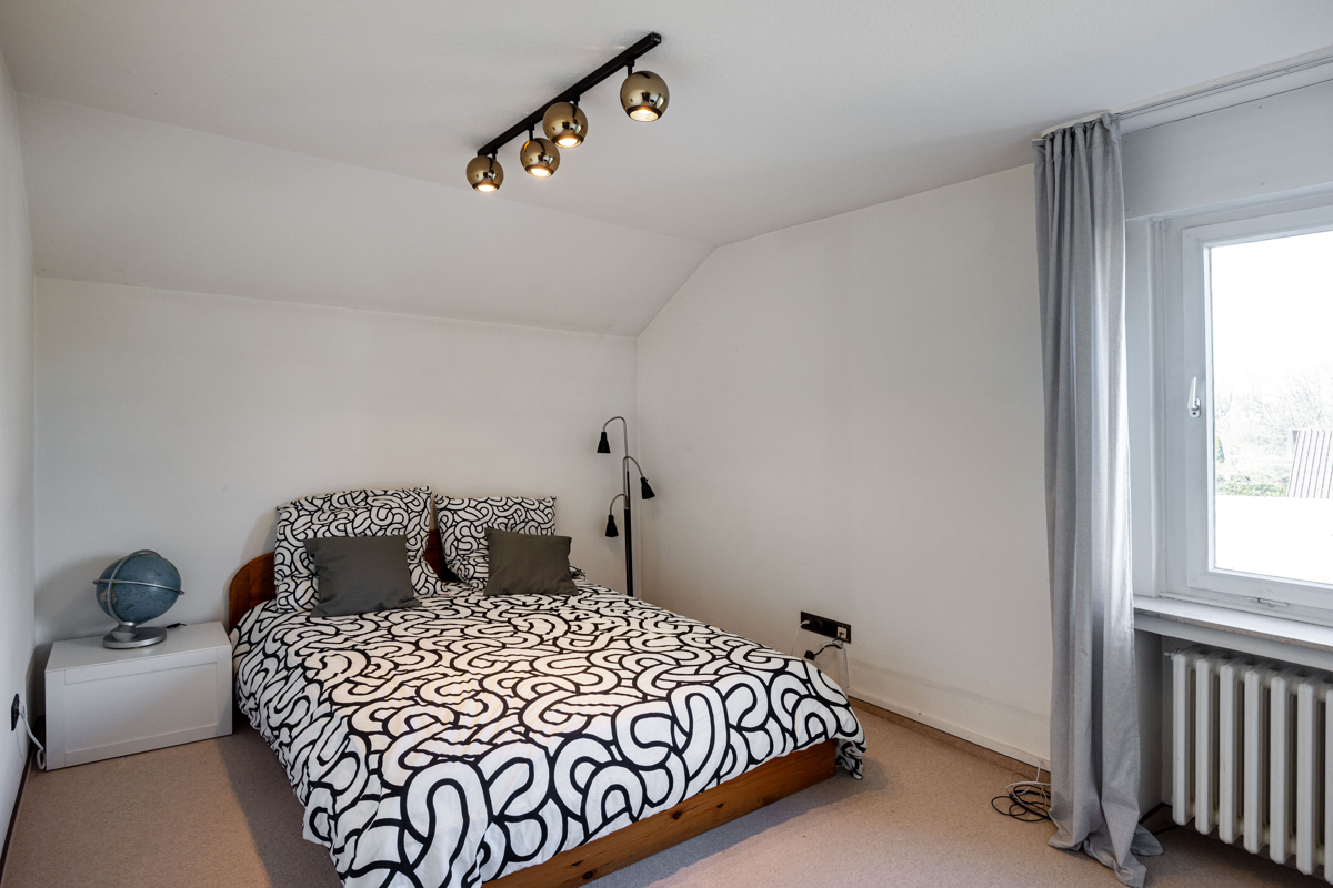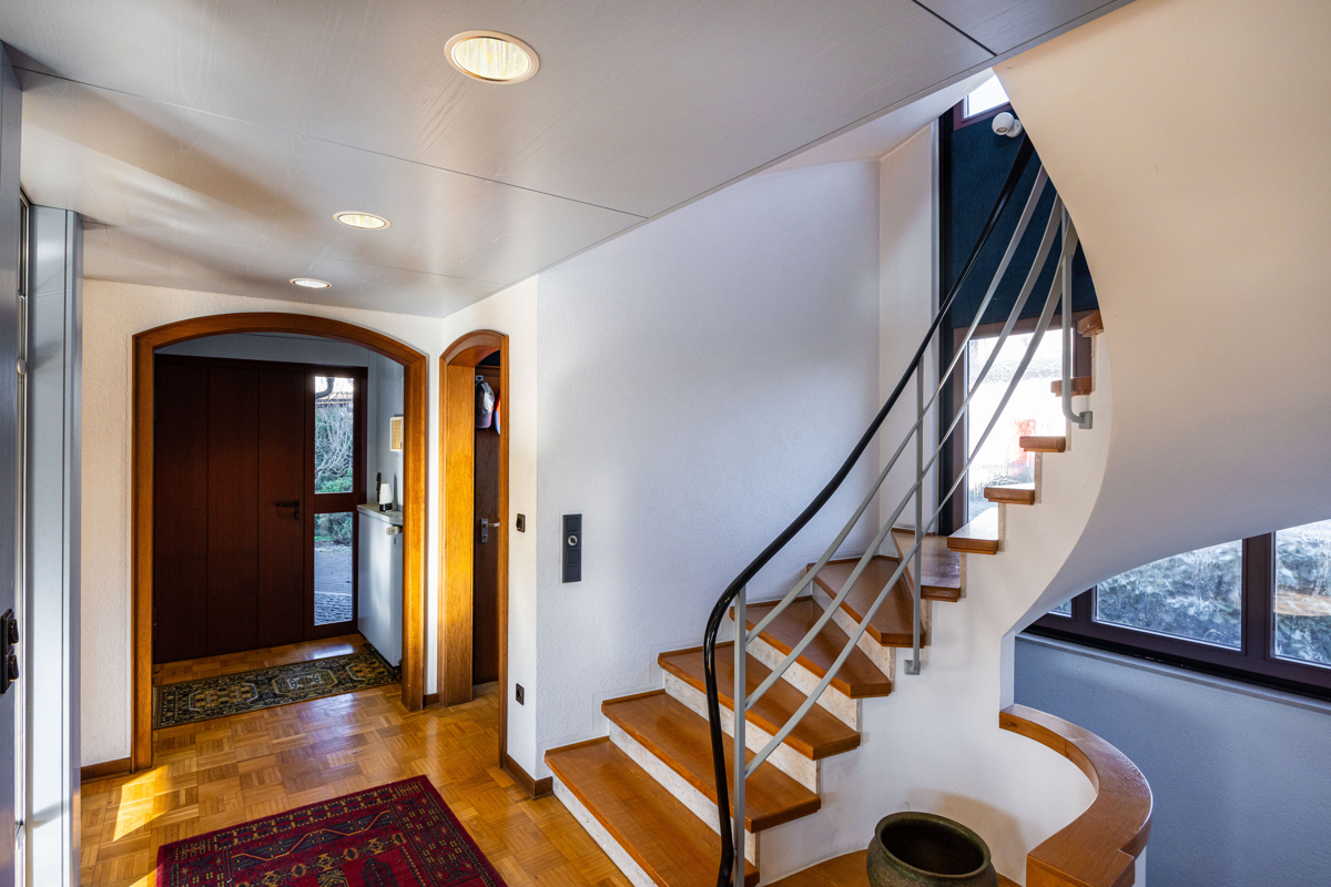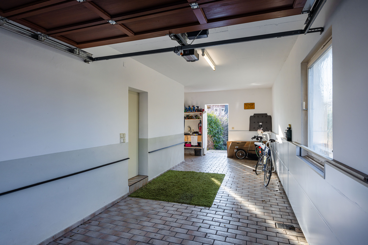 Das großzügige Familienhaus mit übergroßer Garage liegt auf einem sehr hübsch angelegten Grundstück. Lebensmittelpunkt dieser besonderen Immobilie ist der 46 m² große Wohn-/Essbereich mit großer Fensterfront, der zu jeder Jahreszeit einen tollen Blick in den Garten bietet. Auf der davorliegenden großen Terrasse mit Markise und angrenzendem Teich lassen sich die Sommerabende herrlich genießen. Außerdem verfügt das EG über Küche mit Einbauküche, Büro und Gäste-WC. Im OG liegen das Schlafzimmer mit Ankleide inklusiv großzügiger Einbauschränke, zwei weitere Räume und das Bad mit Dusche und Fenster. Der Parkettboden im kompletten Erdgeschoss, die geschwungene Treppe zur Empore und die hochwertige Ausstattung unterstreichen den Charme und den 1a Pflegezustand des Hauses. Praktische Vorteile sind je 2 Zugänge zum Keller und ins Obergeschoss. Der Dachboden über der Garage wurde wohnlich ausgebaut und bietet viel zusätzliche Fläche mit 2 Räumen plus Bad (Nfl.) und ist mit dem Haupthaus verbundenLage