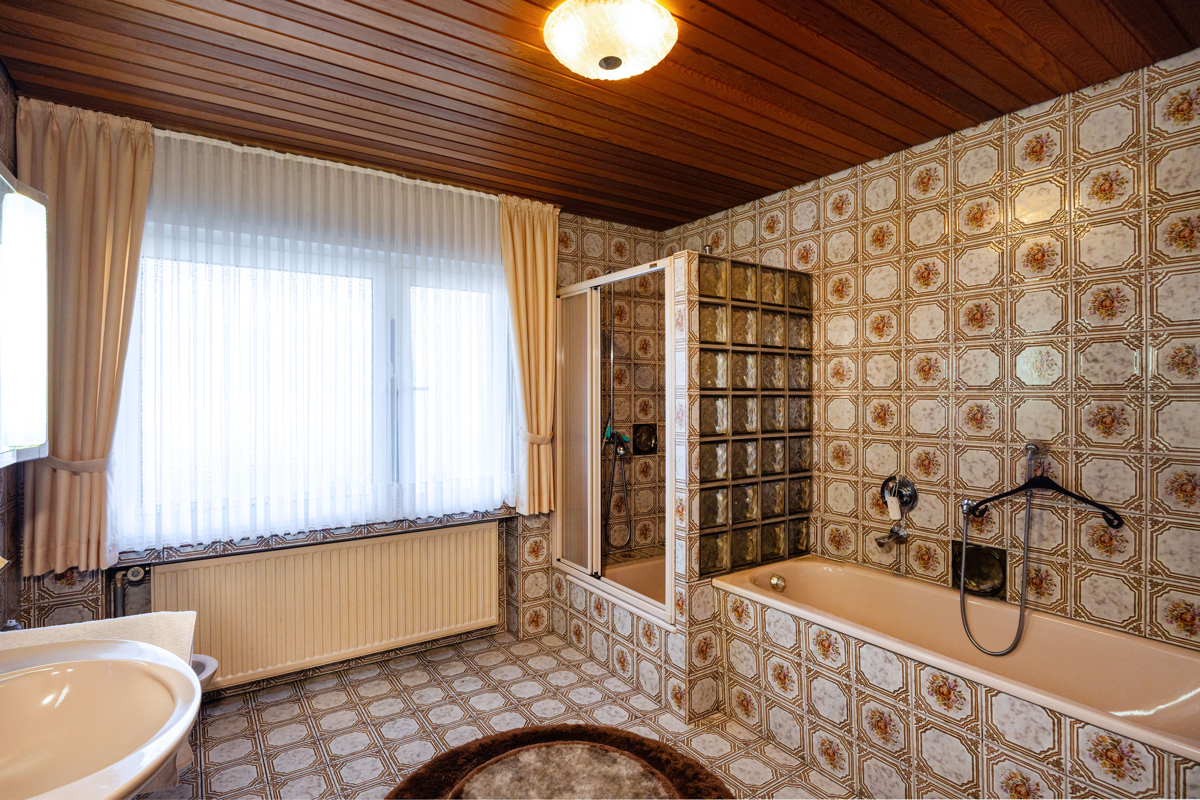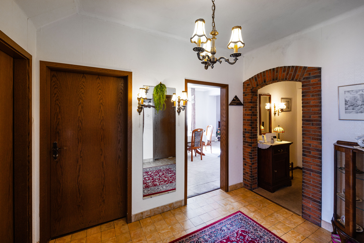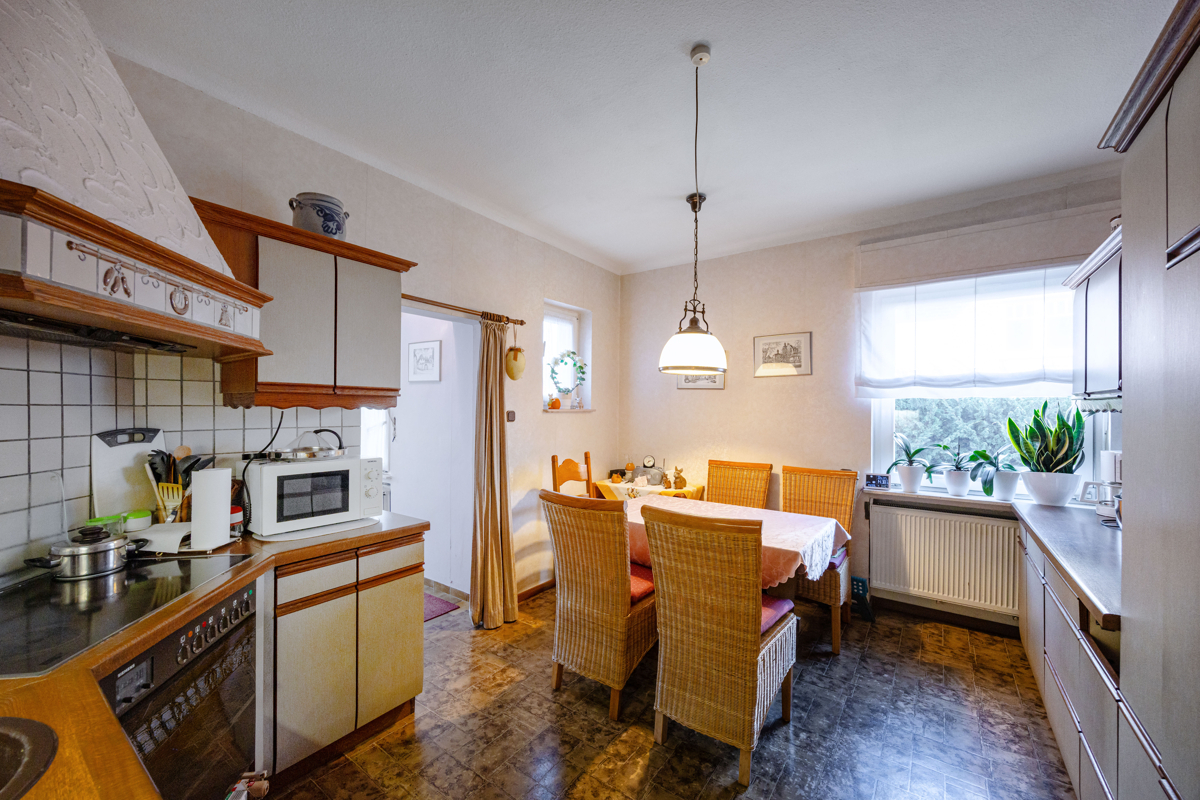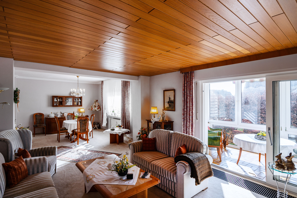 Dieses solide Familienhaus steht vor einem Generationswechsel und bietet Käufern die Möglichkeit, ein gepflegtes Zuhause ganz nach eigenen Vorstellungen zu modernisieren. In ruhiger, zugleich zentraler Lage präsentiert sich die Immobilie mit ca. 186 m² Wohnfläche als idealer Raum für Familien. Die Highlights im Überblick: Licht und Offenheit: das Herzstück des Hauses bildet der großzügige, offen gestaltete Wohn- und Essbereich. Große Fensterflächen schaffen eine helle, freundliche Atmosphäre. Von hier aus gelangen Sie direkt in den gemütlichen Wintergarten – ein perfekter Ort zum Entspannen. Sowohl von der Küche als auch vom Wohnbereich führt der Weg auf die überdachte Terrasse. Der angrenzende, uneinsehbare Garten bietet eine weitläufige Gartenfläche. Großzügiges Raumangebot mit Potenzial: insgesamt sieben Zimmer bieten viel Platz für Familie, Homeoffice oder Gäste. Das gepflegte Erdgeschoss umfasst zwei Bäder (eines davon mit Dusche und Badewanne), ein Gäste-WC sowie drei weitere helle Räume. Bereits auf dieser Ebene eröffnen sich vielfältige Nutzungsmöglichkeiten. Im Obergeschoss erwarten Sie drei weitere großzügige, sanierungsbedürftige Zimmer. Sie eignen sich flexibel als Eltern- oder Kinderzimmer, Homeoffice oder Hobbyraum. Praktische Extras: die Immobile bietet einen Vollkeller sowie zwei Garagen - praktisch und komfortabel zugleich.Lage