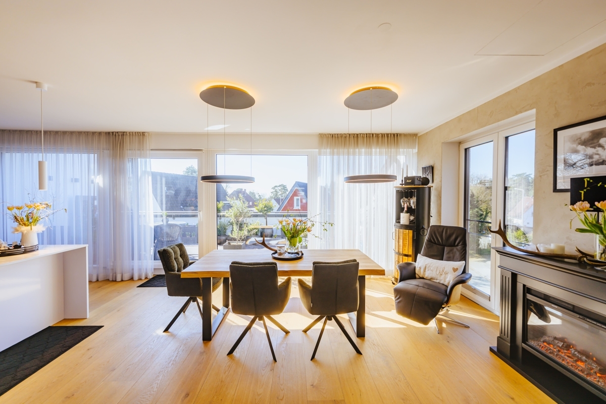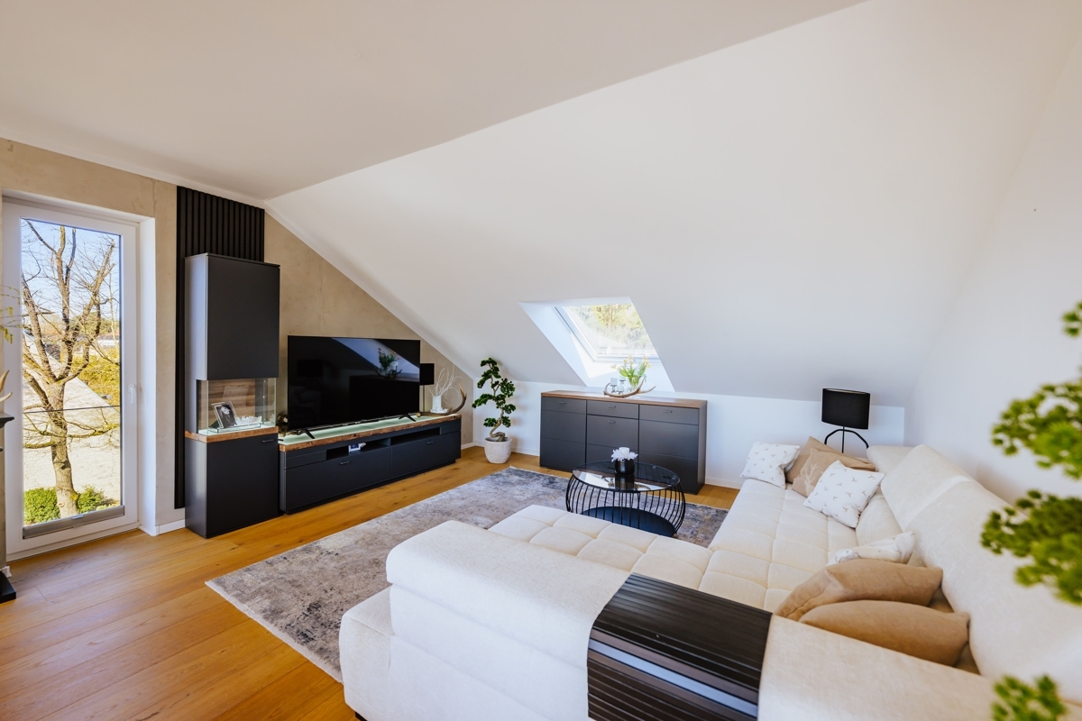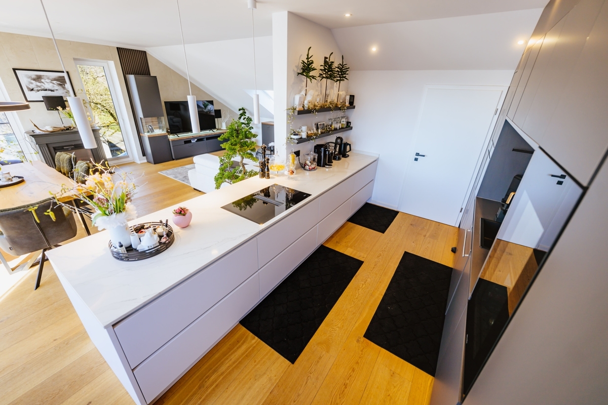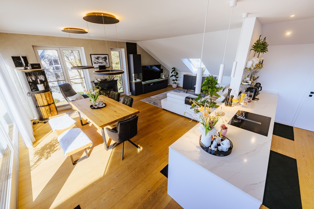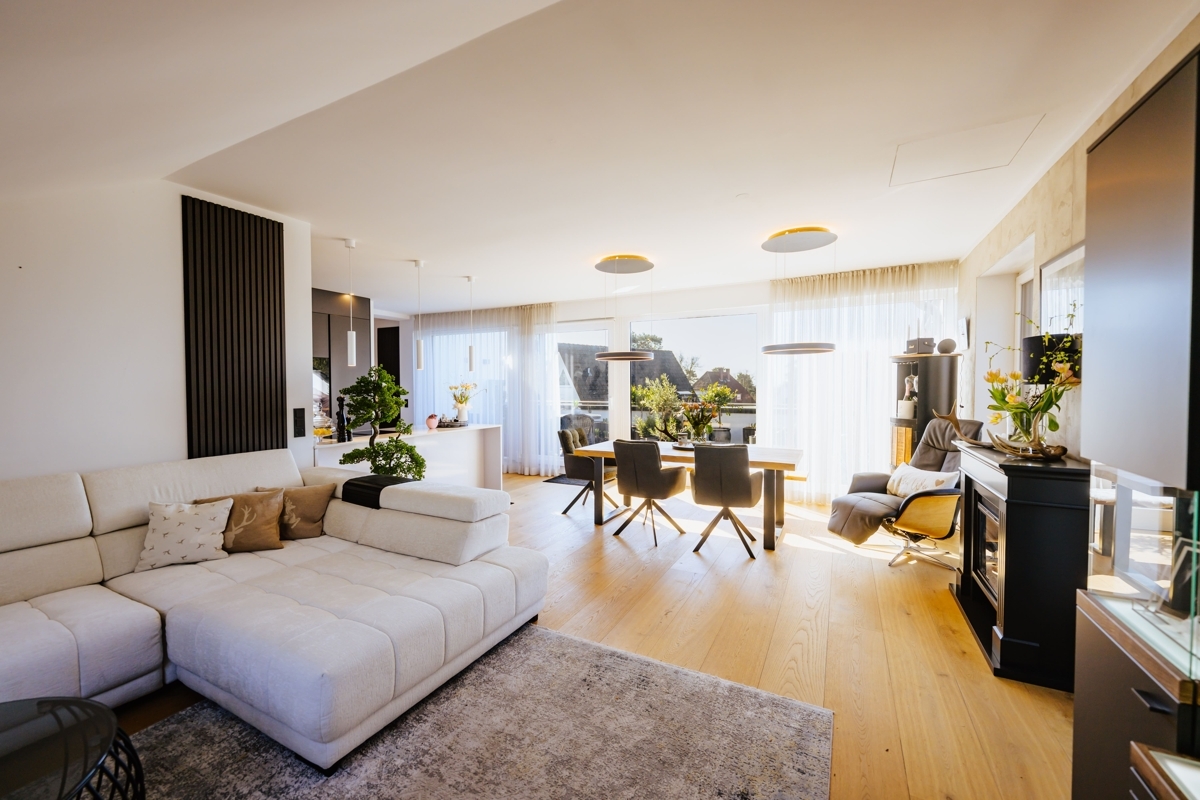 Diese außergewöhnliche Wohnung verbindet modernes Wohnen mit einem besonderen Maß an Komfort und Großzügigkeit. Schon die direkte Fahrt mit dem Aufzug in die Wohnung vermittelt ein exklusives Wohngefühl. Ein echtes Highlight ist die großzügige Südterrasse mit ca. 26 m², die Ihnen einen herrlichen Ausblick und viel Platz für sonnige Stunden im Freien bietet. Die Highlights im Überblick: Wohnen über den Dächern: das Herzstück der Wohnung ist der beeindruckende Wohn- und Essbereich. Lichtdurchflutet und offen gestaltet, entsteht hier durch die bodentiefe Fensterfront zur Terrasse eine ganz besondere Wohnatmosphäre mit viel Weite und Helligkeit. Ein Platz an der Sonne: die großzügige Südterrasse erweitert den Wohnraum auf angenehme Weise nach draußen und wird schnell zum Lieblingsplatz – ob für das Frühstück in der Sonne, entspannte Abendstunden oder gesellige Momente mit Gästen. Modernes Wohnkonzept mit Stil: die einseitig offene Küche fügt sich harmonisch in den Wohnbereich ein und unterstreicht den zeitgemäßen Grundriss. Die hochwertige Einbauküche sowie der direkt angeschlossene Vorratsraum sorgen dabei für eine ideale Kombination aus Design und Funktionalität. Hochwertige Ausstattung mit stimmigem Gesamtbild: Edler Parkettboden in den Wohnräumen und großformatige Fliesen in einem warmen Beigekonzept im Flur und Bad schaffen ein modernes und zugleich wohnliches Ambiente. Weiß gestrichene Vliestapeten und weiße Türen greifen das klare Farbkonzept des Hauses stilvoll auf und verleihen den Räumen eine elegante Ruhe. Komfort bis ins Detail: das Tageslichtbad mit bodengleicher Dusche präsentiert sich modern und einladend. Ergänzt wird der großzügige Grundriss durch ein separates Gäste-WC sowie zwei weitere Abstellräume, die im Alltag wertvollen Stauraum bieten. Diese Wohnung ist ideal für alle, die das Besondere suchen: ein Zuhause mit Charakter, Licht, Weitblick und einem Wohnkonzept, das Komfort und Ästhetik auf gelungene Weise vereint.Lage