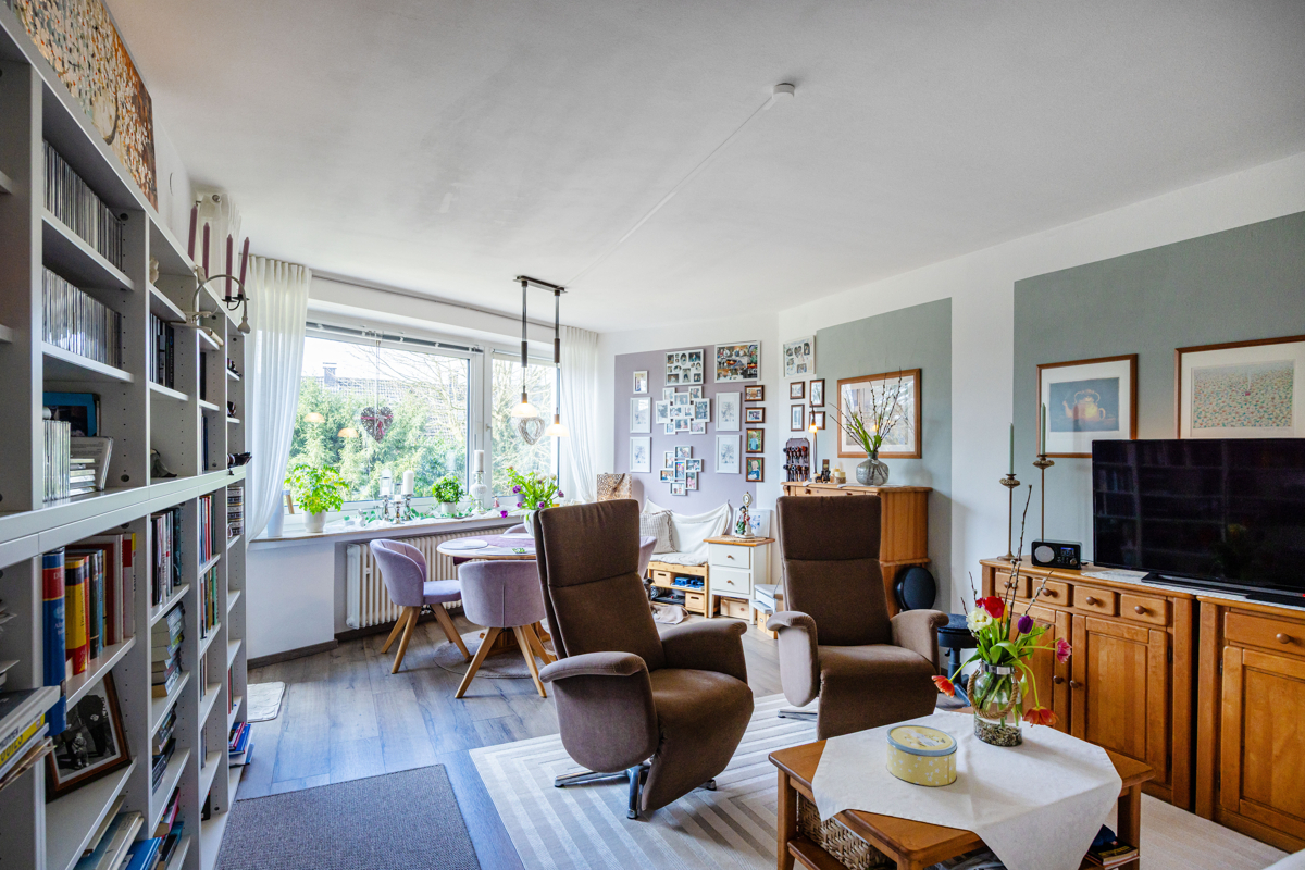 Das Mehrfamilienhaus präsentiert sich in einem sehr gepflegten Zustand. Die 2-Zimmer-Wohnung befindet sich im 1. Obergeschoss und punktet durch einen guten Grundriss. Ca. 63 m² Wohnfläche bieten geräumiges Wohnen aufgeteilt auf 2 Räume, eine Diele mit integrierter Garderobe, eine Küche und ein Bad mit Waschmaschinenanschluss sowie Durchlauferhitzer. Vom Wohn-/ Essbereich hat man Zugang zur Loggia mit elektrischer Markise und herrlichem Blick ins Grüne. Das ca. 10m² große Mansardenzimmer im Dachgeschoss bietet weitere sinnvolle Nutzfläche. Ein Kellerraum gehört zum Angebot. Der Gemeinschaft stehen im Keller ein Waschraum und ein gemeinschaftlicher Trockner (bedienbar mit Münzen) sowie ein Fahrradkeller zur Verfügung.Lage