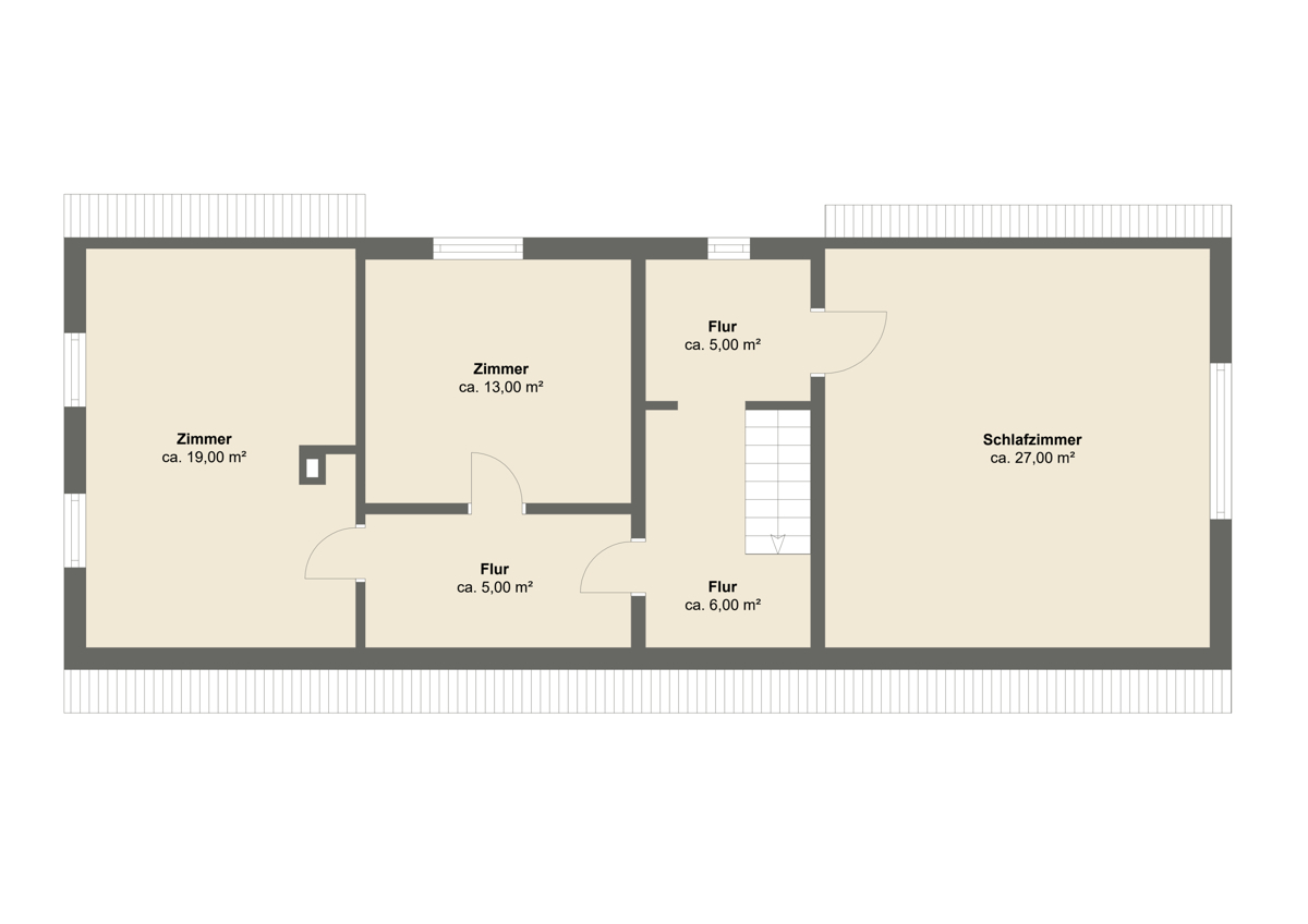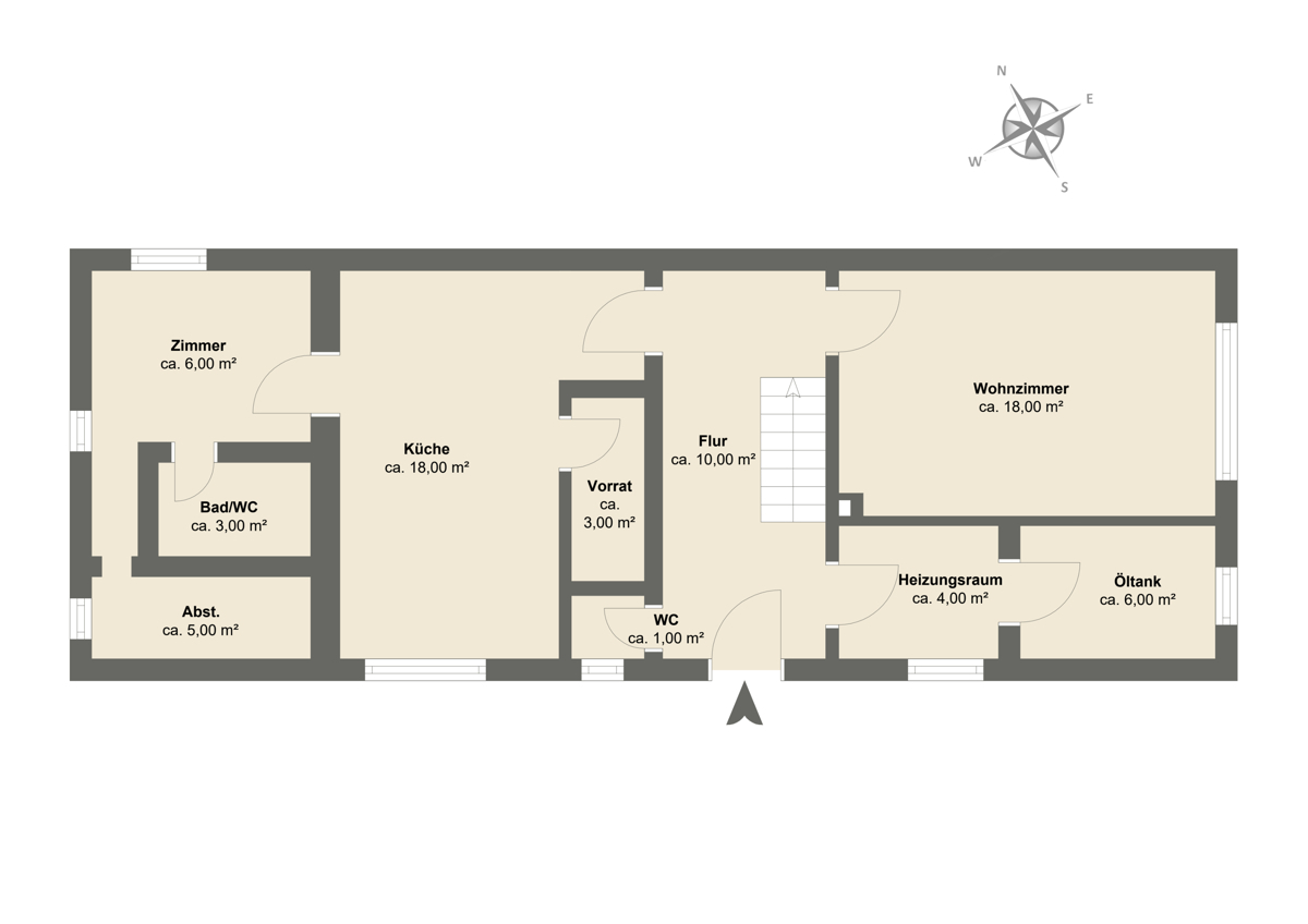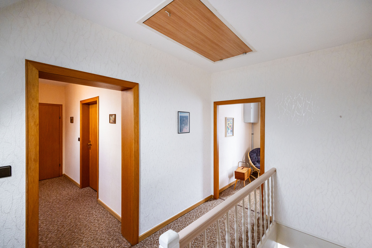 im Erdgeschoss liegen das Wohnzimmer sowie eine große Wohnküche in der man herrlich frühstücken kann mit praktischem Vorratsraum. Ebenfalls auf dieser Ebene befinden sich das Bad mit Wanne und das separate WC, die Waschküche und die Nutzräume der Heizungsanlage. Über eine schöne Holztreppe gelangt man ins Obergeschoss mit 3 Räumen wobei das Schlafzimmer ausgesprochen viel Platz bietet. Ein Plus ist der hohe Drempel, sodaß die Räume wenig Schräge aufweisen.