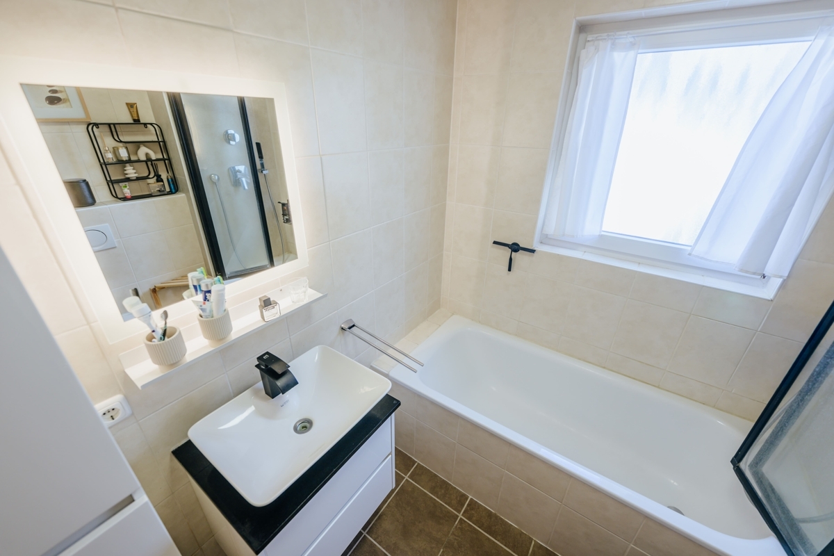 das Gäste-WC sowie das Hauptbad mit Badewanne präsentieren sich in einer modernen, beige-gefliesten und gepflegten Ausstattung.