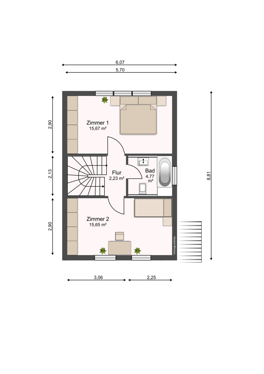 im Obergeschoss befinden sich 2 gut geschnittene Zimmer mit angenehmer Größe, die vielfältig genutzt werden können. Das ausgebaute Dachgeschoss bietet zusätzlichen Wohnraum und erweitert die Nutzungsmöglichkeiten des Hauses.