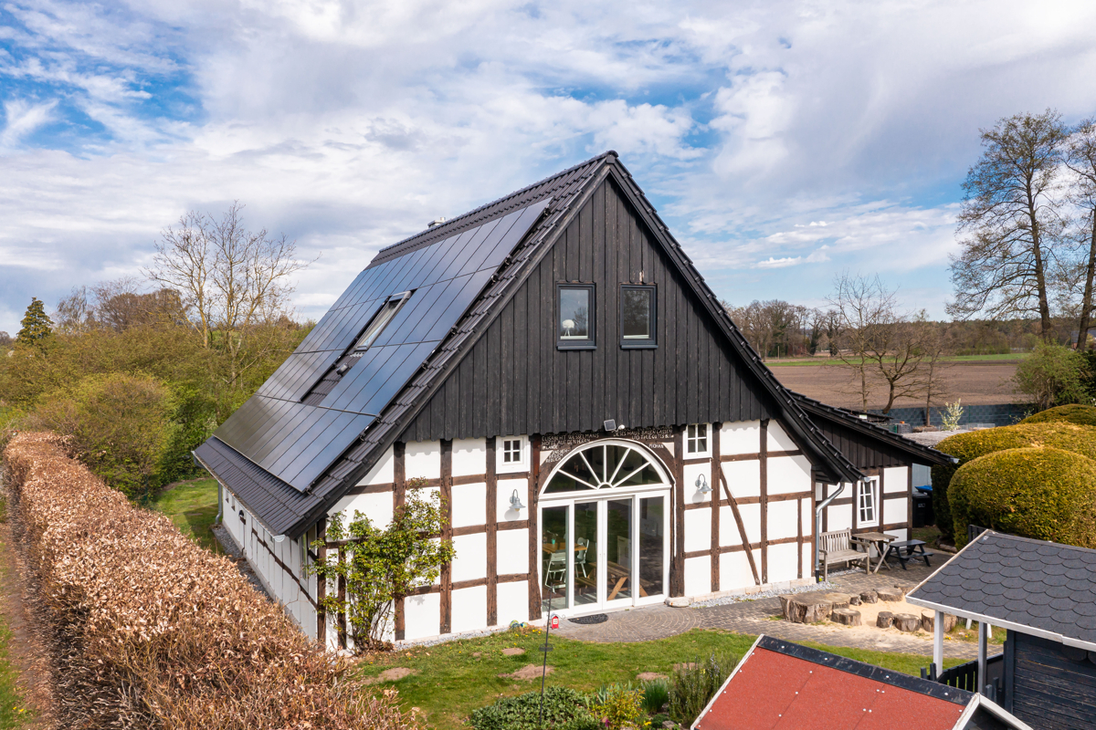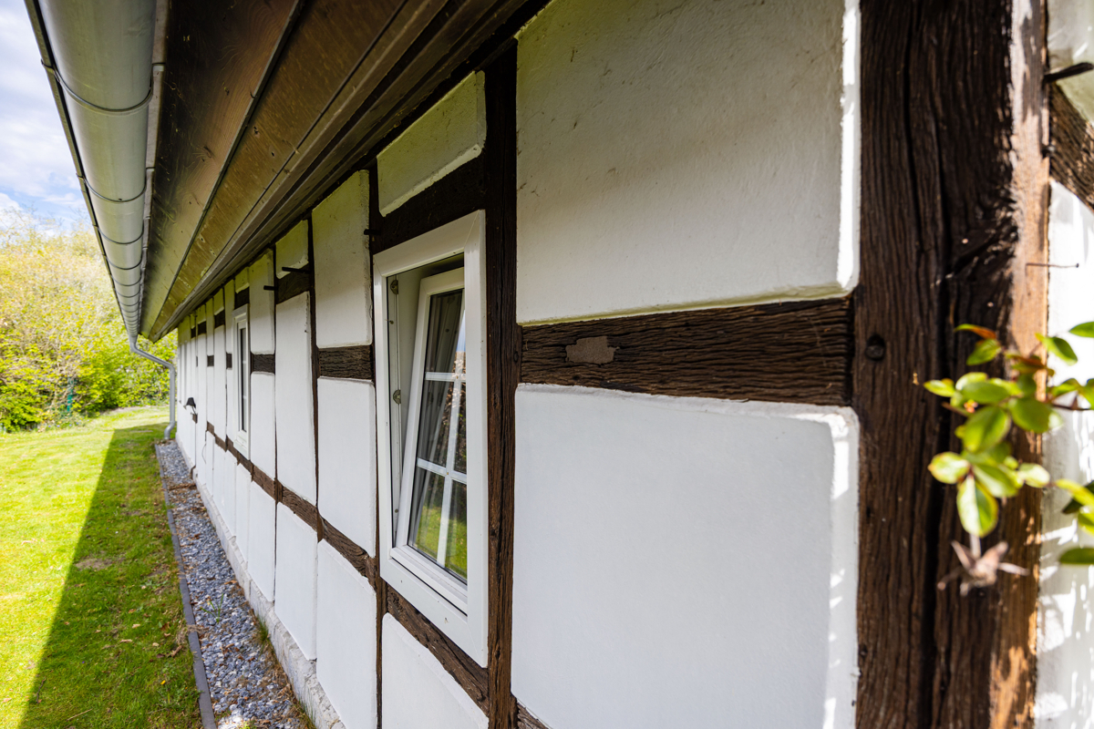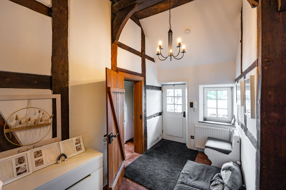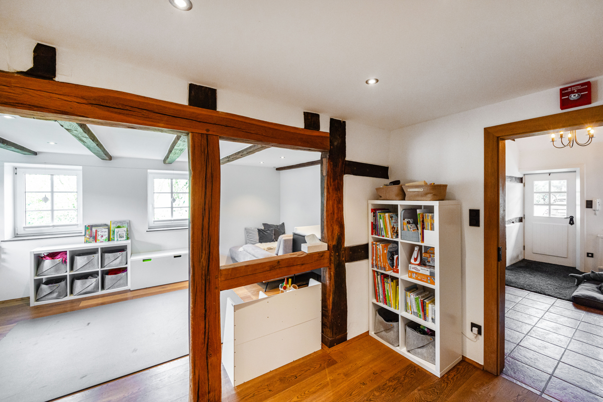 freigelegte, aufgearbeitete Holzbalken, originale Fachwerkelemente und warme Holztöne verleihen dem Haus eine unverwechselbare Ausstrahlung. In Kombination mit klaren Linien, hellen Oberflächen und hochwertigen Materialien entsteht eine besondere Wohnatmosphäre, die Tradition und Moderne perfekt miteinander verbindet.