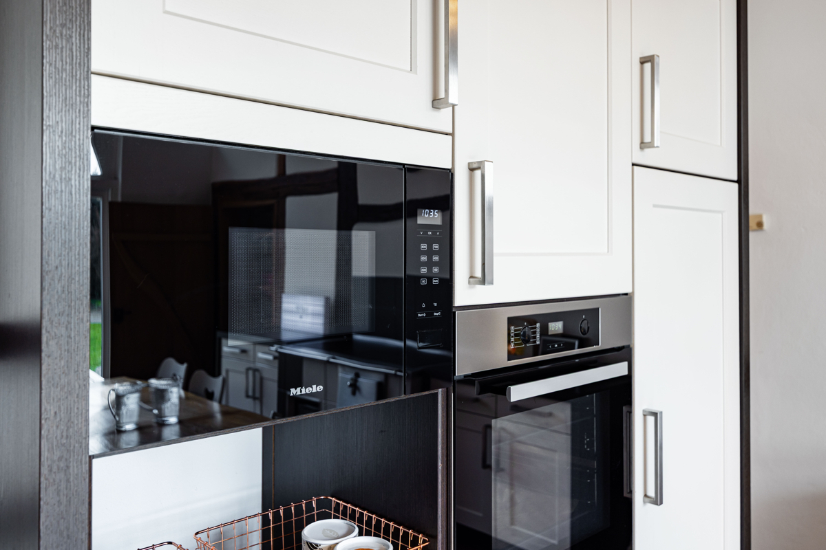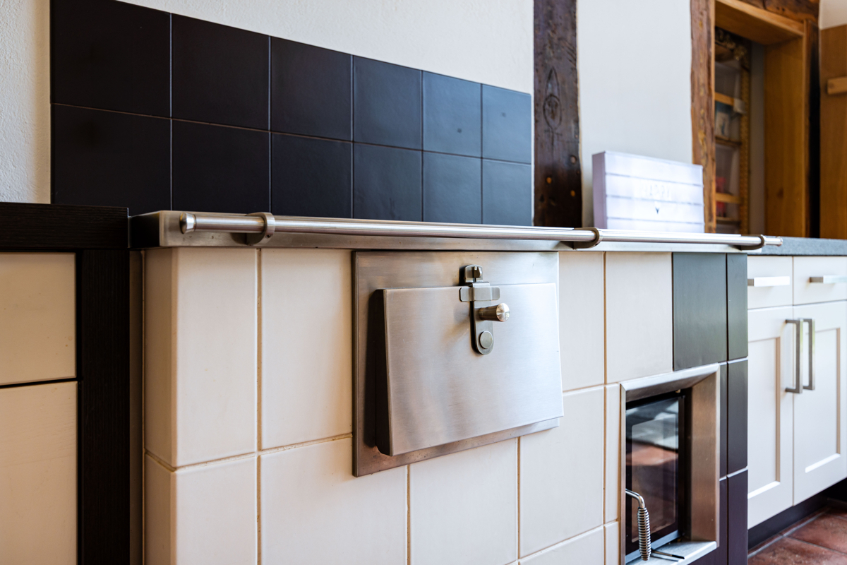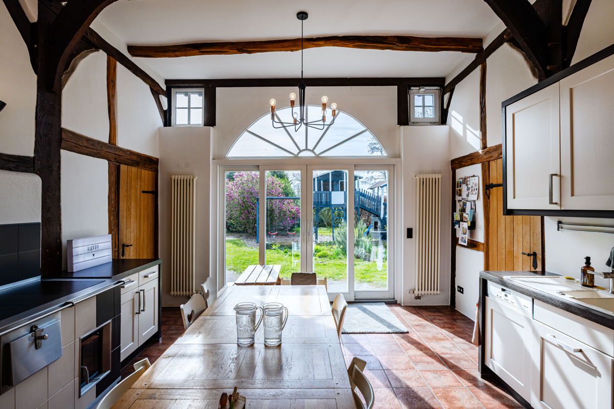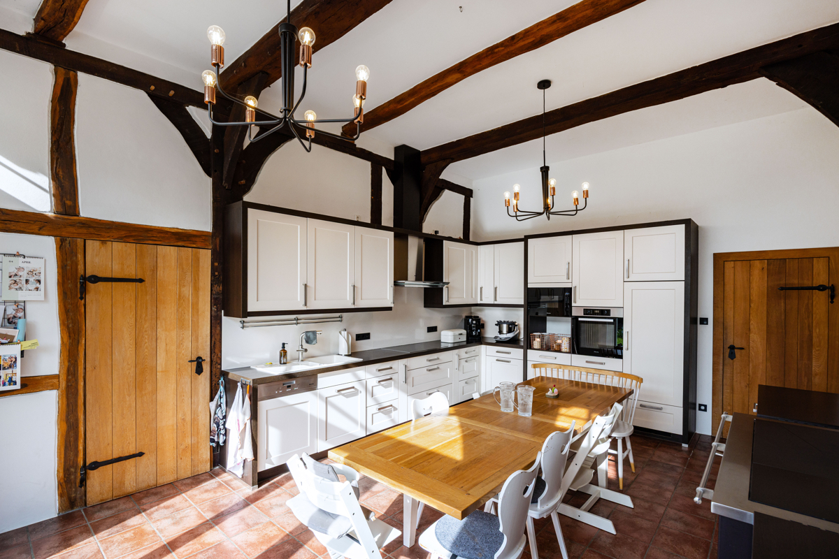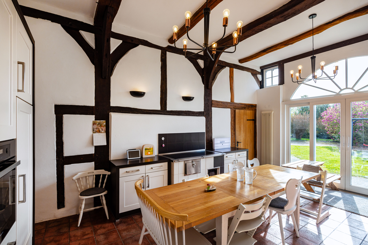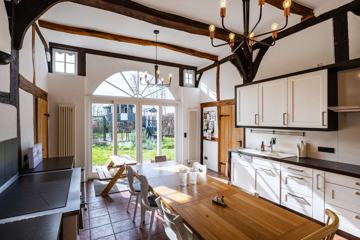 die stilvolle Einbauküche mit hochwertigen Geräten fügt sich harmonisch in das Fachwerkensemble ein und überzeugt durch ihre moderner Funktionalität und dem rustikalem Charme. Der angrenzende Essbereich mit hoher Decke und sichtbarer Balkenkonstruktion schafft einen einzigartigen Ort für gemeinsame Stunden.