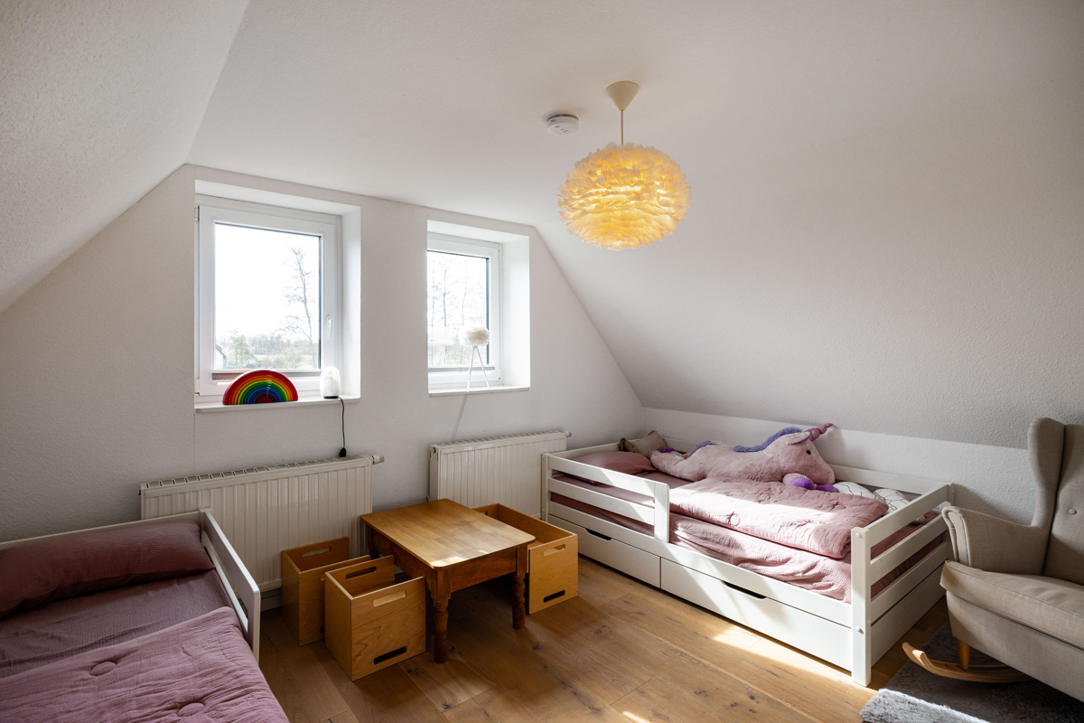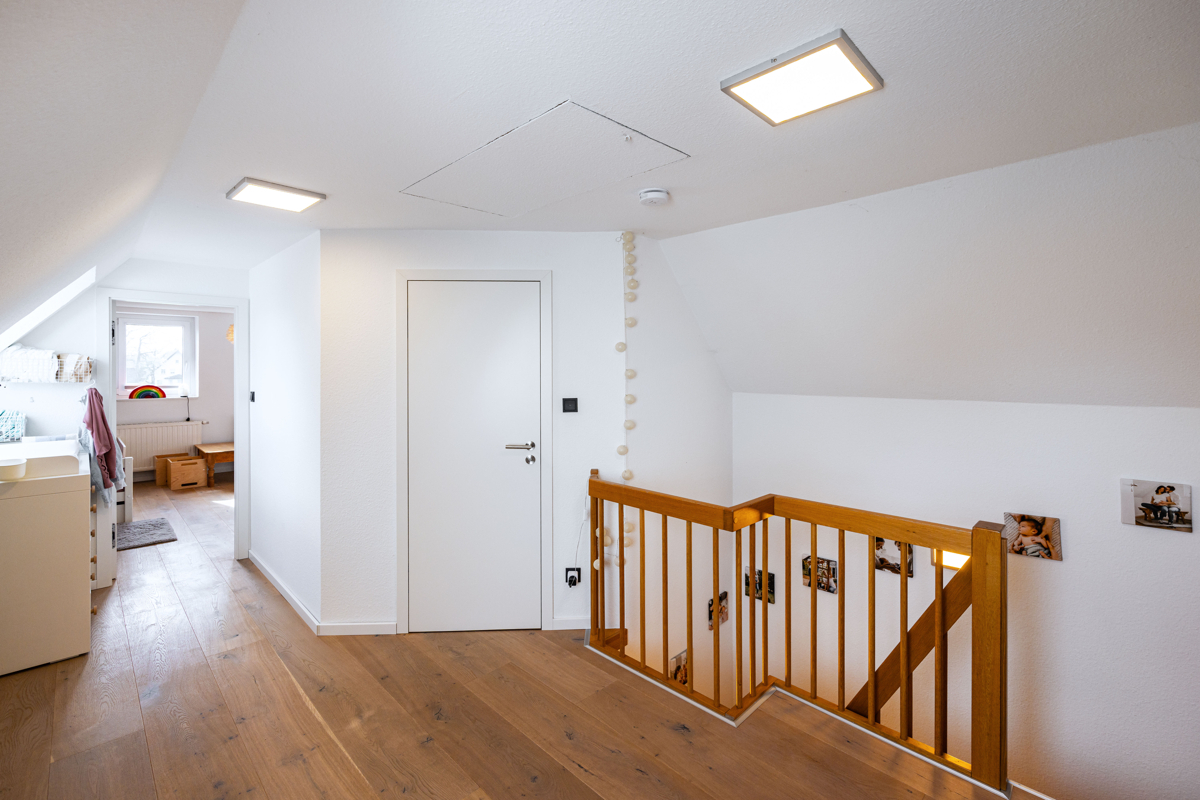 das Haus bietet vielfältige Nutzungsmöglichkeiten mit mehreren hellen Schlafzimmern im Obergeschoss. Die Räume überzeugen durch ihre freundliche Gestaltung, angenehme Lichtverhältnisse und eine behagliche Wohnatmosphäre. Ergänzt wird das Raumangebot durch moderne, geschmackvoll ausgestattete Bäder mit Dusche, Badewanne und Tageslicht.